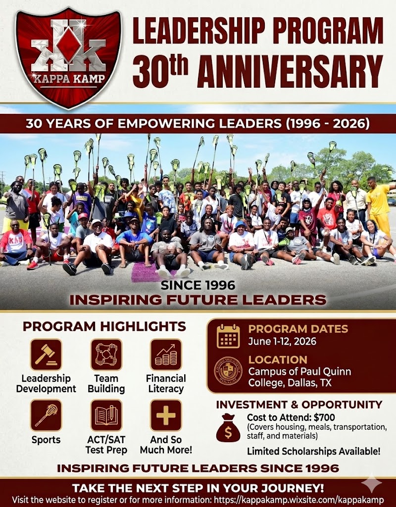 The Kappa Kamp Leadership Program proudly announces its 30th Anniversary Celebration, marking three decades of developing young leaders of character, discipline, and vision. The 2026 program will be hosted on the campus of Paul Quinn College in Dallas, Texas.